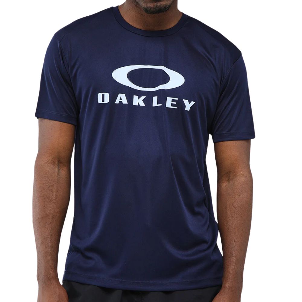 Desenvolvida com o padrão de excelência da marca Oakley, a camisa é produzida em poliéster de alta performance, garantindo leveza e um toque macio, ideal para uso prolongado. A peça exibe um visual na cor Dark Blue (Azul Escuro) e traz a logo da marca estampada em destaque no tórax, reforçando a autenticidade e o estilo esportivo.