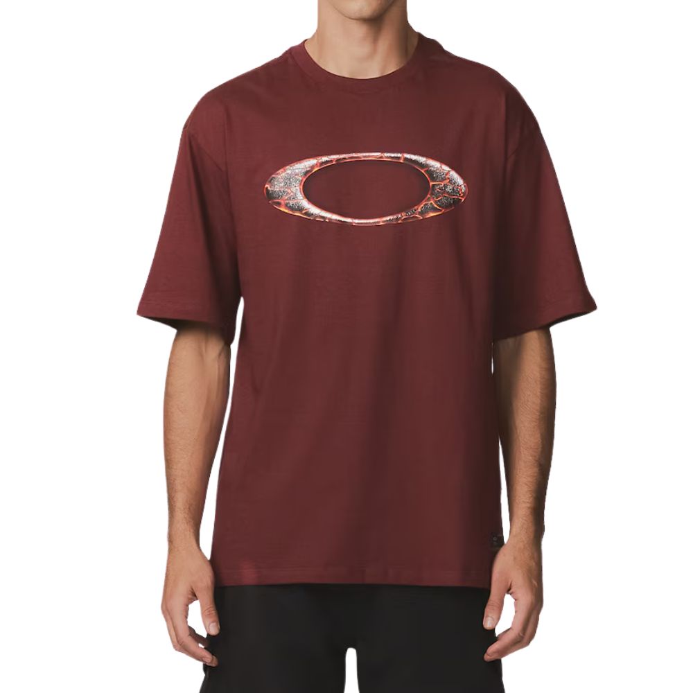 O grande destaque da peça, na cor Red Night, é a releitura do icônico logo Oakley Ellipse. Nesta versão, o logo ganha uma estampa em base d'água com um design moderno e inovador, inspirado em magma, criando um efeito visual marcante e cheio de atitude.